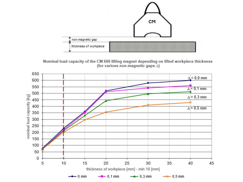 Arbejdsemner, der er for tynde, kan tiltrækkes svagt, fordi løftemagneternes magnetfelt ikke udnyttes fuldt ud. Desuden bøjes tynde emner, og deres kontaktområde med løftemagneterne mindskes, så trækkraften mindskes. Den bedste løfteevne opnås for tilstrækkeligt tykke emner.