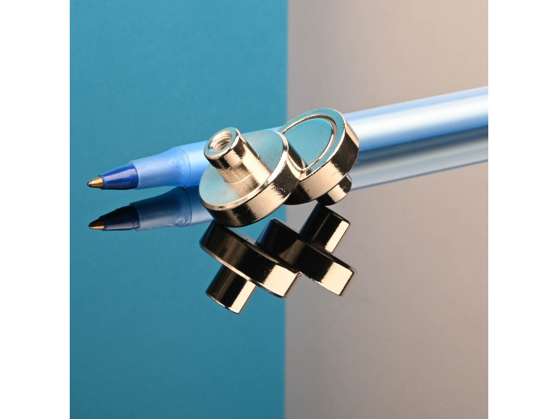 Magneten er limet ind i et stålhus, så den er mere beskyttet mod stød. I huset er der en skrue med indvendigt gevind til fastgørelse af kroge eller øjebolte. På grund af huset er magneten enkeltsidet.
