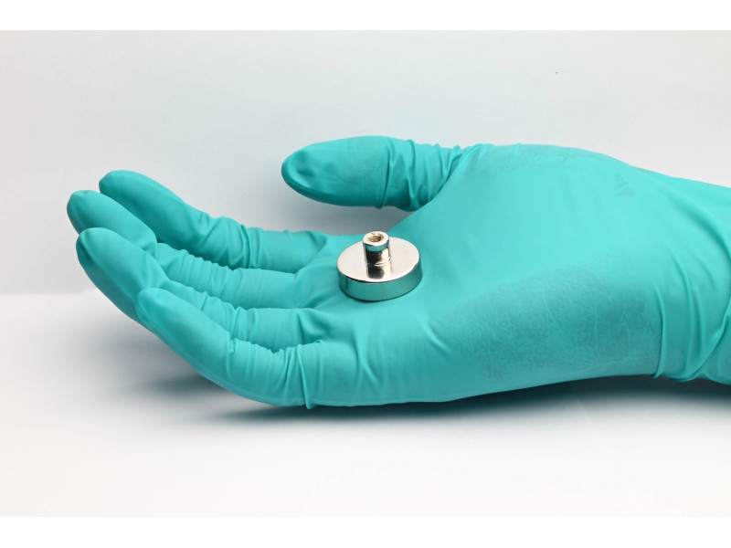 Magneten er limet ind i et stålhus, så den er mere beskyttet mod stød. I huset er der en skrue med indvendigt gevind til fastgørelse af kroge eller øjebolte. På grund af huset er magneten enkeltsidet.