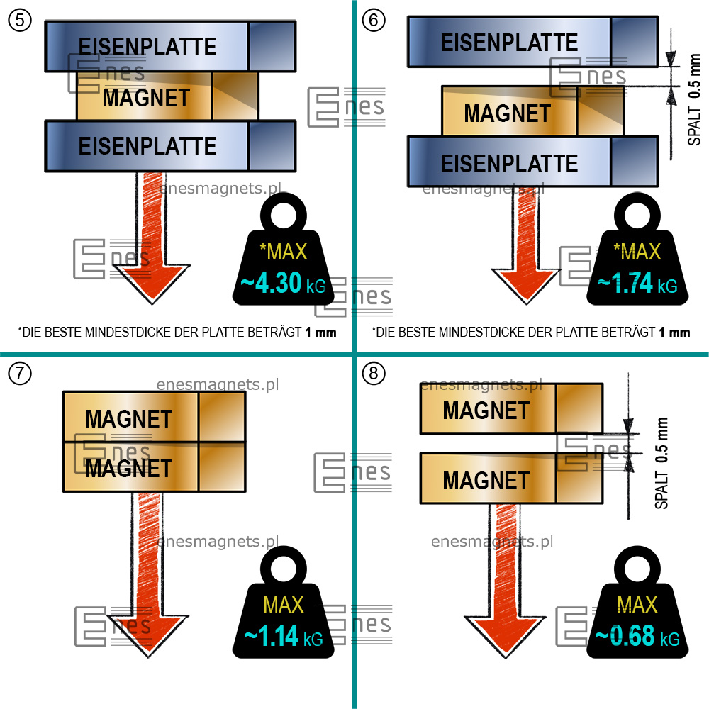 Die oben angegebene maximale Tragfähigkeit wurde mit glatten, polierten Blechen gemessen. Das verwendete Blech hatte eine optimale Dicke. Die Abzugskraft wirkte senkrecht. Bei einer parallel zum Blech wirkenden Kraft, d.h. beim Bewegen des Magneten über das Blech, ist die Hebekraft des Magneten deutlich geringer. Der Spalt zwischen dem Magneten und dem Blech, der dadurch entsteht, dass das Blech mit einer Farbschicht oder einem galvanischen Überzug bedeckt ist, führt ebenfalls zu einer Verringerung der Hebekraft des Magneten. Jede Rauheit oder Unebenheit des Blechs verringert ebenfalls die Haftkraft des Magneten. Die höchste Hebekraft wird durch die Verwendung eines ausreichend dicken Blechs mit einem hohen Eisenanteil erreicht. Die Verwendung von Stahl- oder Gusseisenblechen mit hohem Kohlenstoffgehalt führt zu einer geringeren Tragkraft. Die maximale Tragkraft wird auch von der Betriebstemperatur des Magneten beeinflusst. Ein beheizter Magnet hat eine geringere Tragkraft.