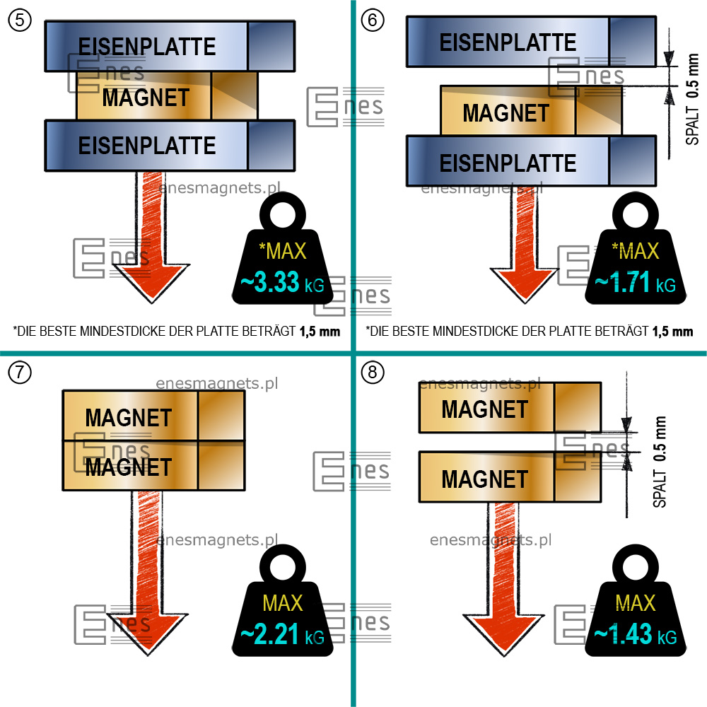 Die oben angegebene maximale Tragfähigkeit wurde mit glatten, polierten Blechen gemessen. Das verwendete Blech hatte eine optimale Dicke. Die Abzugskraft wirkte senkrecht. Bei einer parallel zum Blech wirkenden Kraft, d.h. beim Bewegen des Magneten über das Blech, ist die Hebekraft des Magneten deutlich geringer. Der Spalt zwischen dem Magneten und dem Blech, der dadurch entsteht, dass das Blech mit einer Farbschicht oder einem galvanischen Überzug bedeckt ist, führt ebenfalls zu einer Verringerung der Hebekraft des Magneten. Jede Rauheit oder Unebenheit des Blechs verringert ebenfalls die Haftkraft des Magneten. Die höchste Hebekraft wird durch die Verwendung eines ausreichend dicken Blechs mit einem hohen Eisenanteil erreicht. Die Verwendung von Stahl- oder Gusseisenblechen mit hohem Kohlenstoffgehalt führt zu einer geringeren Tragkraft. Die maximale Tragkraft wird auch von der Betriebstemperatur des Magneten beeinflusst. Ein beheizter Magnet hat eine geringere Tragkraft.