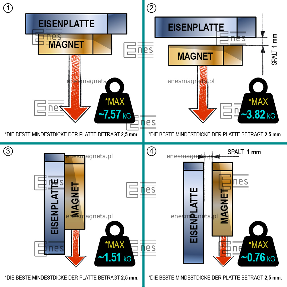Die oben angegebene maximale Tragfähigkeit wurde mit glatten, polierten Blechen gemessen. Das verwendete Blech hatte eine optimale Dicke. Die Abzugskraft wirkte senkrecht. Bei einer parallel zum Blech wirkenden Kraft, d.h. beim Bewegen des Magneten über das Blech, ist die Hebekraft des Magneten deutlich geringer. Der Spalt zwischen dem Magneten und dem Blech, der dadurch entsteht, dass das Blech mit einer Farbschicht oder einem galvanischen Überzug bedeckt ist, führt ebenfalls zu einer Verringerung der Hebekraft des Magneten. Jede Rauheit oder Unebenheit des Blechs verringert ebenfalls die Haftkraft des Magneten. Die höchste Hebekraft wird durch die Verwendung eines ausreichend dicken Blechs mit einem hohen Eisenanteil erreicht. Die Verwendung von Stahl- oder Gusseisenblechen mit hohem Kohlenstoffgehalt führt zu einer geringeren Tragkraft. Die maximale Tragkraft wird auch von der Betriebstemperatur des Magneten beeinflusst. Ein beheizter Magnet hat eine geringere Tragkraft.