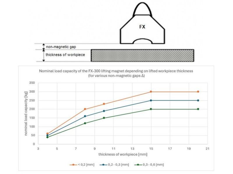 ♦ tõstemagneti pinna ja tõstetava detaili vahelise õhuvahe suurusest (iga tõstemagneti puhul on esitatud võimsuse karakteristikud sõltuvalt mittemagnetilise vahe suurusest).