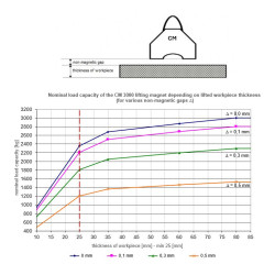 ♦ tõstemagneti pinna ja tõstetava detaili vahelise õhuvahe suurusest (iga tõstemagneti puhul on esitatud võimsuse karakteristikud sõltuvalt mittemagnetilise vahe suurusest).
