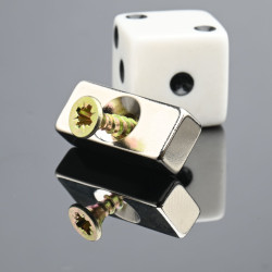 Kyseessä on neodyymimagneetti, joka on magnetisoitu korkeussuunnassa. Siinä on kaksi napaa, joten se on kaksipuolinen. Se on suojattu korroosiolta nikkelipinnoituksella. Se on valmistettu erinomaisten mittatoleranssien mukaisesti. Suurin käyttölämpötila on enintään 80 celsiusastetta. Neodyymimagneetit tarttuvat metallipintaan. Voit kiinnittää magneetin ferromagneettisista materiaaleista valmistettuihin pintoihin. Tämä magneetti on vahva mittoihinsa nähden. Tämä on ruuvikiinnitteinen neodyymimagneetti. Neodyymimagneetti ruuvattavaksi. Neodyymimagneetti uppoasennettu reikälohko. Neodyymimagneettilohko, jossa on upotettu reikä.
