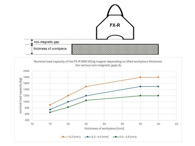 ♦ nostomagneetin pinnan ja nostettavan työkappaleen välisen ilmaraon koosta (kunkin nostomagneetin osalta on annettu kapasiteetin ominaisuudet ei-magneettisen raon koon funktiona).