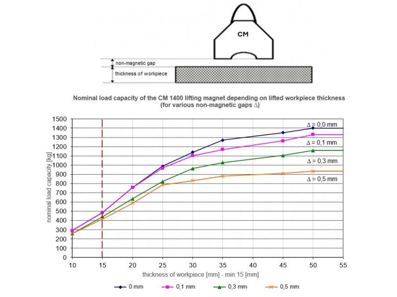 ♦ az emelőmágnes felülete és az emelni kívánt munkadarab közötti légrés méretétől (az egyes emelőmágnesek esetében a kapacitásjellemzők a nem mágneses rés méretének függvényében vannak megadva).