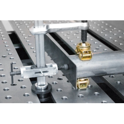 Az oldaltámaszok a hegesztőbilincsek sínjén használhatók. A szorító lökete és hatótávolsága hosszabb vagy rövidebb alátétre cserélésével módosítható.