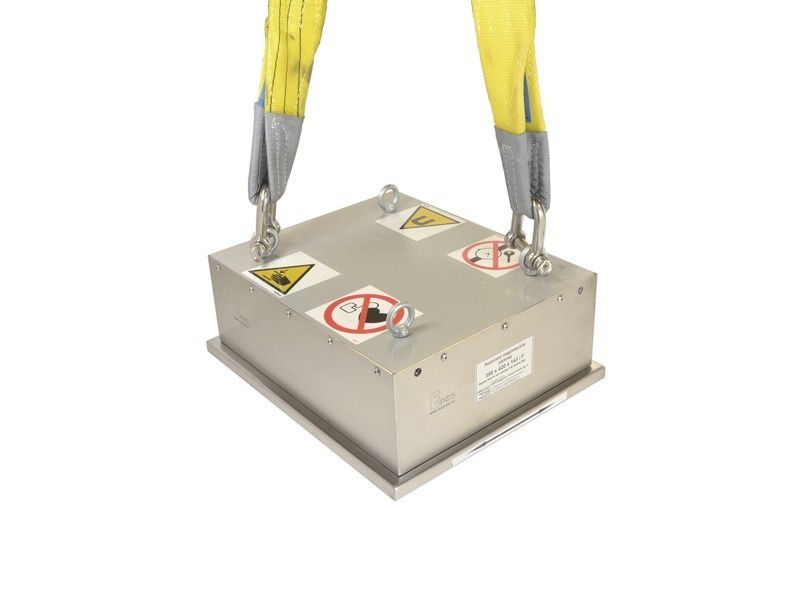 A szállítószalag fölé szerelt szeparátor a szállított anyagokból (élelmiszeripar, műanyag-feldolgozás, ásványi nyersanyagok feldolgozása, újrahasznosítás stb.) a nem kívánt acél- és vaselemek felfogására szolgál. Bizonyos szögben felszerelve csúszdaszeparátorként is hasznos lehet. A saválló acélból készült légmentes ház ferritmágnesekkel szerelt mágneses rendszert tartalmaz. A szeparátor alsó felülete mágnesesen aktív. A szeparátor négy sarkán M8-as csavarozott nyílások találhatók, amelyekbe a felfüggesztéshez használt szemek vannak becsavarozva.
