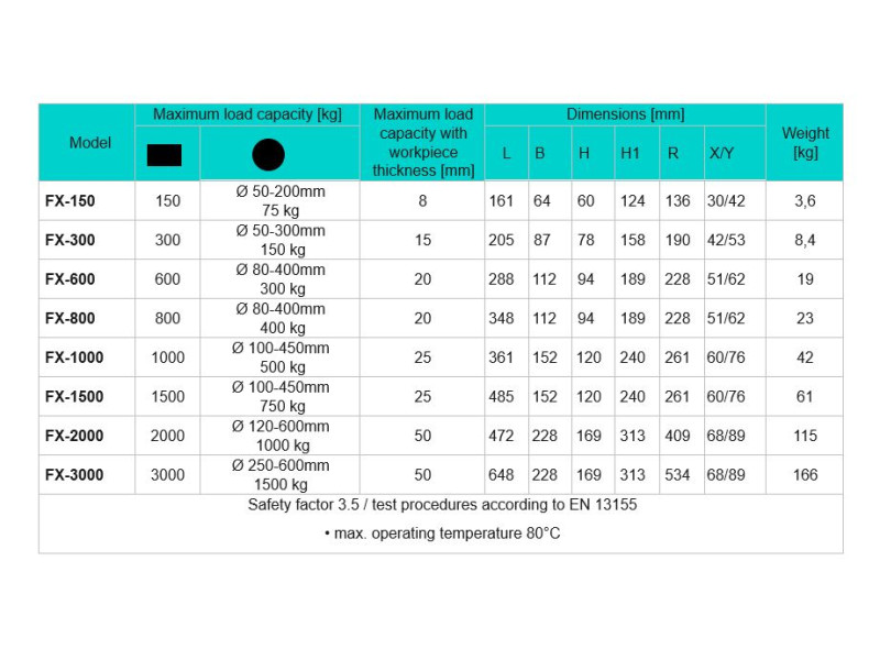 Visos FX keltuvų plieninės sudedamosios dalys yra nikeliuotos, todėl jos yra atsparesnės korozijai. Tai unikali savybė, taikoma visiems FX serijos kėlimo magnetams.