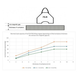 ♦ gaisa spraugas lieluma starp pacēlāja virsmu un pacelējamo detaļu (katram pacelšanas magnētam ir norādītas celtspējas īpašības atkarībā no nemagnētiskās spraugas lieluma).