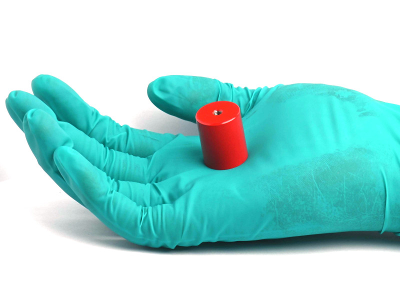 Deze magneet in behuizing is rond, cilindrisch, in de vorm van een cilinder of schijf.