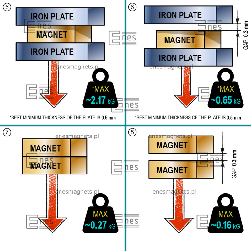 De maximale hefcapaciteit die hierboven is gespecificeerd, is gemeten met glad, gepolijst plaatstaal. Het gebruikte plaatstaal was van optimale dikte. De trekkracht werkte loodrecht. Bij een kracht die evenwijdig aan het plaatwerk werkt, dus wanneer de magneet over het plaatwerk wordt bewogen, zal de hefcapaciteit van de magneet aanzienlijk lager zijn. De spleet tussen de magneet en het plaatmetaal als gevolg van het feit dat het plaatmetaal bedekt is met een verflaag of galvanische coating, zal ook een afname van de hefcapaciteit van de magneet veroorzaken. Ook ruwheid of oneffenheden van het plaatwerk verminderen de hefcapaciteit van de magneet. De hoogste hefcapaciteit wordt bereikt door een voldoende dikke plaat te gebruiken die een grote hoeveelheid ijzer bevat. Het gebruik van staal met een hoog koolstofgehalte of gietijzer resulteert in een lagere hefcapaciteit. De maximale hefcapaciteit wordt ook beïnvloed door de bedrijfstemperatuur van de magneet. Een verwarmde magneet zal een lagere hefcapaciteit hebben.