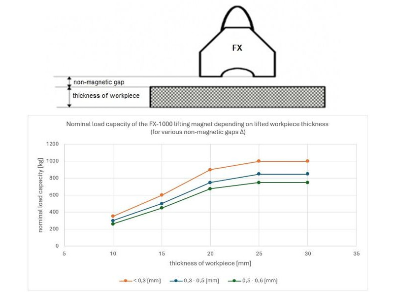 | Espessura da peça de trabalho [mm] | Capacidade de carga nominal do FX-1000 [kg] | ||