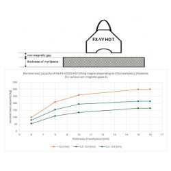 Os ímanes de elevação da série FX-VV HOT foram especialmente concebidos para utilização a temperaturas elevadas. Eles podem ser usados continuamente com peças de trabalho de elevação cuja temperatura é de 250oC. Também é possível elevar peças de trabalho com temperaturas mais elevadas, mas neste caso a operação não deve ser contínua e deve haver pausas no contacto entre o íman de elevação e a peça de trabalho quente. O contacto com a peça de trabalho, que tem uma temperatura máxima de 300oC, pode durar no máximo 4 minutos, com um tempo mínimo de arrefecimento para o íman de elevação. O tempo de contacto da pinça com uma peça de trabalho a 350oCnão deve ser superior a 1,5 minutos, após o que a pinça deve ser arrefecida. Trabalhar com peças quentes a 300oCe 350oCreduz a capacidade de carga em 15 e 25 por cento, respetivamente.