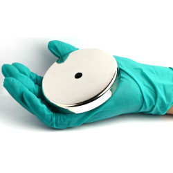 Este íman em caixa é circular, cilíndrico, com a forma de um cilindro ou de um disco.