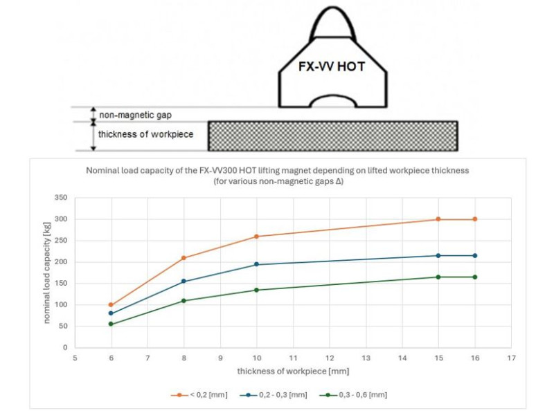 Magneții de ridicare din seria FX-VV HOT sunt special concepuți pentru utilizarea la temperaturi ridicate. Acestea pot fi utilizate în mod continuu cu ridicarea pieselor de prelucrat a căror temperatură este de 250oC. De asemenea, este posibilă ridicarea pieselor de prelucrat cu temperaturi mai ridicate, dar în astfel de cazuri operațiunea nu trebuie să fie continuă și trebuie să existe întreruperi în contactul dintre magnetul de ridicare și piesa de prelucrat fierbinte. Contactul cu piesa de prelucrat, care are o temperatură maximă de 300oC, poate dura maximum 4 minute, cu un timp minim de răcire pentru magnetul de ridicare. Timpul de contact al clemei cu o piesă de 350oCnu trebuie să depășească 1,5 minute, după care clema trebuie răcită. Lucrul cu piese fierbinți la 300oCși 350oCreduce capacitatea de încărcare cu 15 și respectiv 25 %.