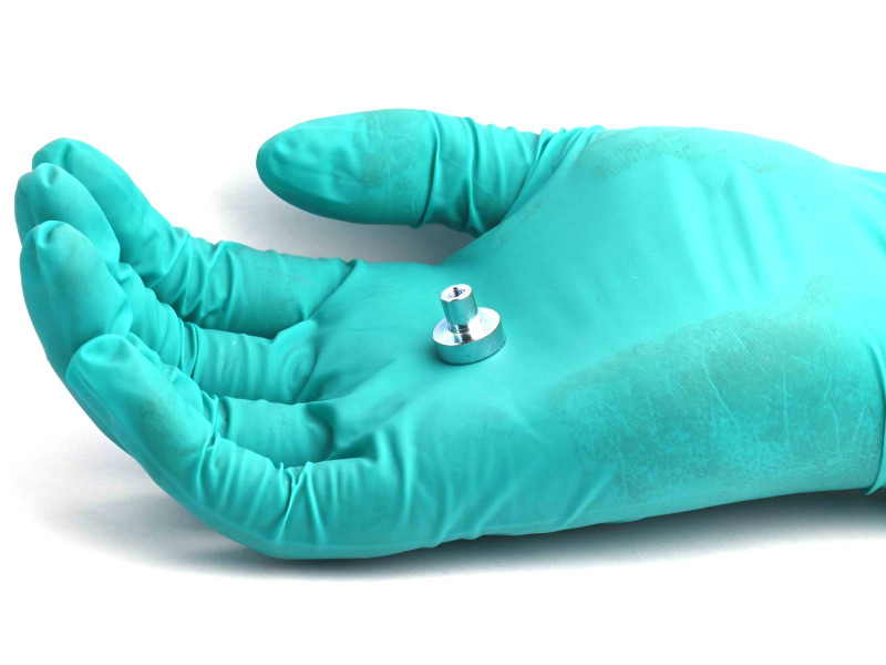 Magnet je vlepený do oceľového puzdra, takže je viac chránený proti nárazom. V puzdre je skrutkové puzdro s vnútorným závitom na pripevnenie hákov alebo skrutiek s okom. Vďaka puzdru je magnet jednostranný.