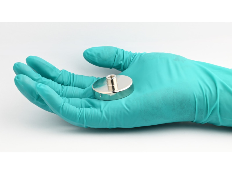 Magnet je vlepený do oceľového puzdra, takže je viac chránený proti nárazom. V puzdre je skrutkové puzdro s vnútorným závitom na pripevnenie hákov alebo skrutiek s okom. Vďaka puzdru je magnet jednostranný.
