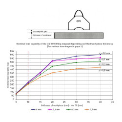 ♦ veľkosti vzduchovej medzery medzi povrchom zdvíhacieho magnetu a zdvíhaným obrobkom (pre každý zdvíhací magnet sú uvedené charakteristiky nosnosti v závislosti od veľkosti nemagnetickej medzery).