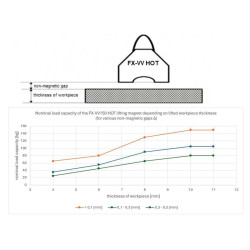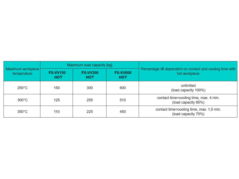 Zdvíhacie magnety série FX-VV HOT sú špeciálne navrhnuté na použitie pri zvýšených teplotách. Môžu sa používať nepretržite pri zdvíhaní obrobkov, ktorých teplota je 250oC. Je možné zdvíhať aj obrobky s vyššou teplotou, ale v takýchto prípadoch nesmie byť prevádzka nepretržitá a v kontakte medzi zdvíhacím magnetom a horúcim obrobkom musia byť prestávky. Kontakt s obrobkom, ktorého maximálna teplota je 300oC, môže trvať maximálne 4 minúty, pričom zdvíhací magnet musí minimálne vychladnúť. Čas kontaktu svorky s obrobkom s teplotou 350oCby nemal byť dlhší ako 1,5 minúty, po ktorom by sa mala svorka ochladiť. Práca s horúcimi obrobkami pri 300oCa 350oCznižuje nosnosť o 15, resp. 25 %.